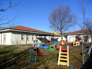 Ogni sezione (ad eccezione della A) dispone di uno sgabuzzino e di servizi igienici propri o, in un caso, condivisi tra due sezioni (B e C). La scuola è dotata, inoltre, di un adeguato spazio esterno, in parte piastrellato in porfido ed in parte erboso, ove sono collocati giochi ed arredi esterni per la grande motricità ed un ampia sabbionaia coperta. Si tratta, dunque, di una scuola grande che può contare su spazi e locali diversificati e complessivamente sufficienti alle necessità educative.